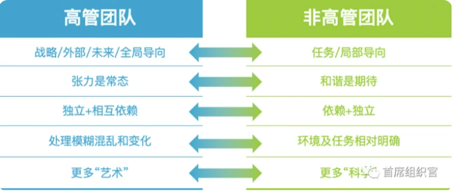 首先,高管团队相对来说是战略、外部、未来、全局导向的;非高管团队相对来说是内部、任务、结果导向。