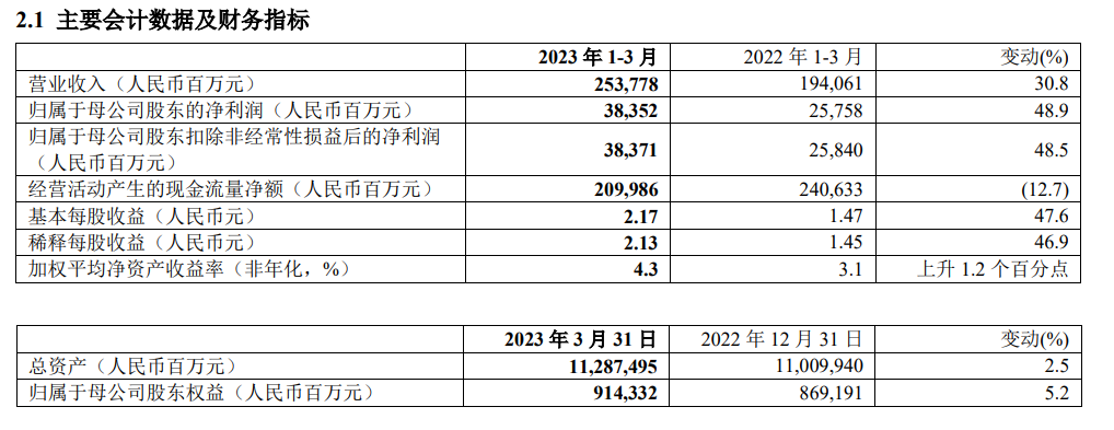 在披露这一变化的当晚,中国平安还发布了2023年一季报。当季,该公司实现营收2537.78亿元,同比增长30.8%;归母净利润383.52亿元,同比增长48.9%。4月27日,中国平安A股涨停,系2015年8月以来首次,收报50.37元/股;H股收报56.15港元/股,上涨8.92%。