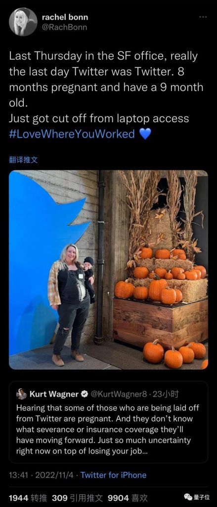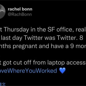 一名怀孕8个月的推特员工发布告别推文,她叫Rachel Bonn,是推特旧金山的(前)内容营销经理。