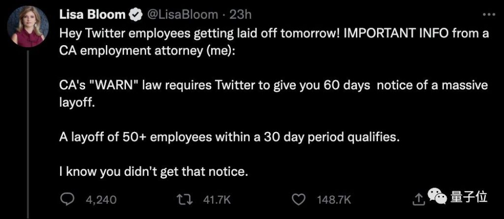 裁员规模如此之巨,但推特并没有按照加州法律,提前60天给出通告。