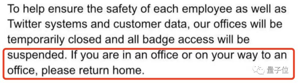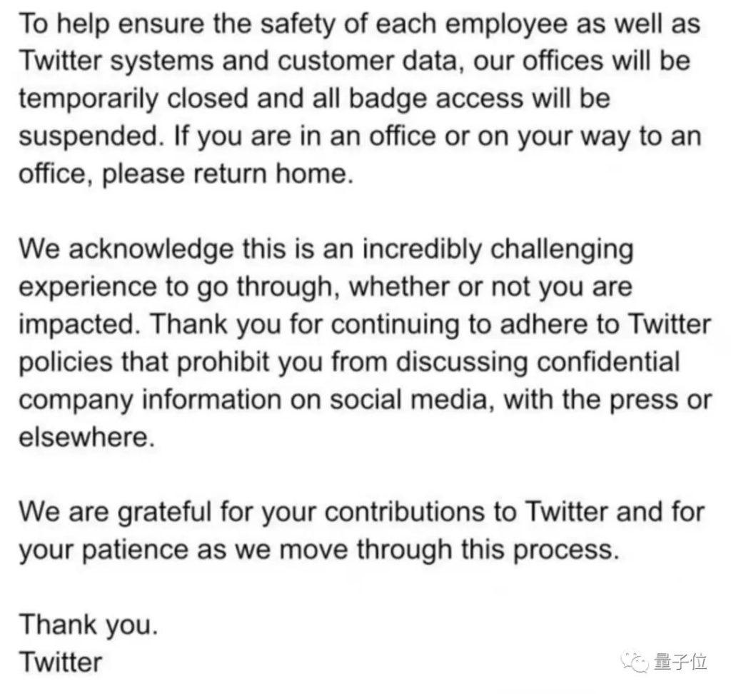 邮件写明,推特大楼和办公室暂时关闭。出于安全考虑,所有员工工牌将暂时失效。大家先回家等邮件,看看自己有没有被裁。