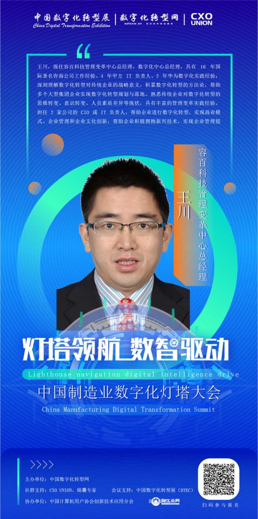 王川,现任容百科技管理变革中心总经理,数字化中心总经理。王川具有 16 年国际著名咨询公司工作经验、4 年甲方 IT 负责人、2 年华为数字化实践经验;王川深刻理解数字化转型对传统企业的战略意义,积累数字化转型的方法论,帮助多个大型集团企业实现数字化转型规划与落地。熟悉传统企业对数字化转型的思维转变、意识转变、人员素质差异等现状,具有丰富的管理变革实践经验。