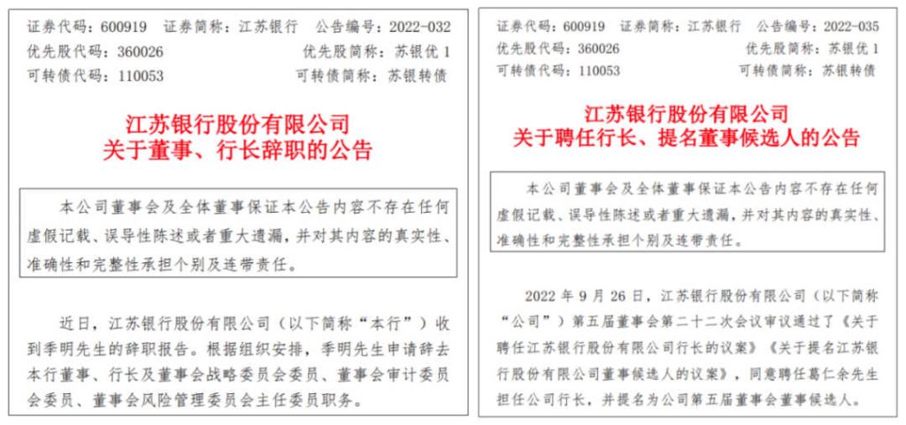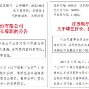 On September 26, the Bank of Jiangsu announced that according to the organizational arrangement, Ji Ming applied to resign from the board of directors, president and members of the strategic Committee of the Board of directors, members of the audit committee of the Board of directors, and chairman of the risk Management Committee of the Board of directors.