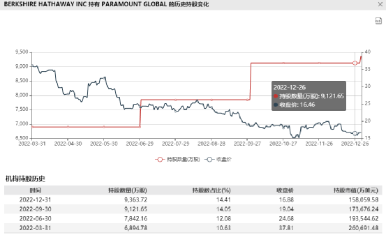 据中国基金报,值得一提的是,巴菲特的投资公司伯克希尔·哈撒韦是该公司的第一大股东。伯克希尔自2022年第一季度开始减仓派拉蒙的股份,并在随后不断增持。截至去年末,伯克希尔已经成为派拉蒙的第一大股东,持股占比14.41%,持股市值达15.8亿美元。