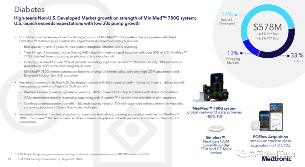 美国市场在耐用泵领域取得了低30%的有机增长,这与MiniMed™ 780G系统在该市场的成功推出有关。该系统在美国获得了广泛的覆盖,包括7月份扩大了对医疗保险受益者的覆盖。该系统也为超过95%的美国人口提供了可用性。
