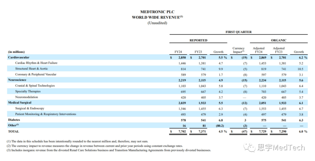 以下是美敦力2024财年第一季度财务表格,包括收入、净收入、每股收益、各部门营收等数据,以及与去年同期的对比。表格中的美元金额均已标注上根据实时汇率兑换的相应人民币数额。CXOUNION CXO联盟