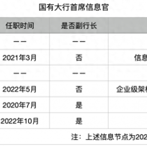 In terms of the six major banks, except Industrial and Commercial Bank of China and Agricultural Bank of China, the other four major banks have chief information officers. Among them, CAI Zhao, the chief information officer of Agricultural Bank, has just been transferred to the vice president of the Bank of China, and before CAI Zhao. The chief information officer of Agricultural Bank was Xu Han, the vice president of the bank.