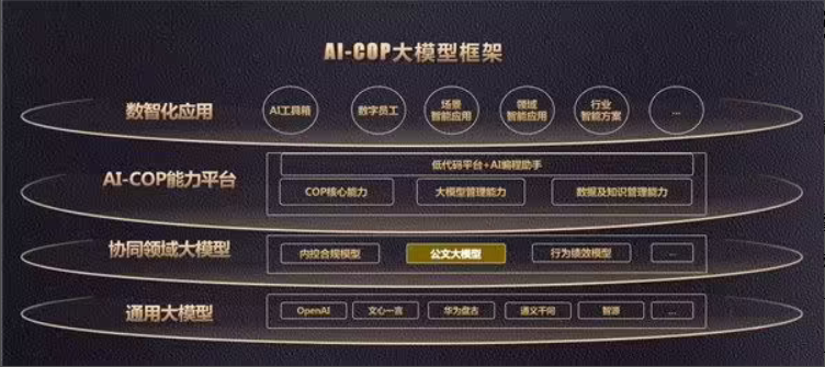 基于致远互联 AI-COP 大模型框架和公文大模型等一系列首度面世的新品,外界可以清楚地看到,未来 AIGC 技术对于原有的 COP 体系将形成三个层面的全面深度 AI 化: