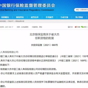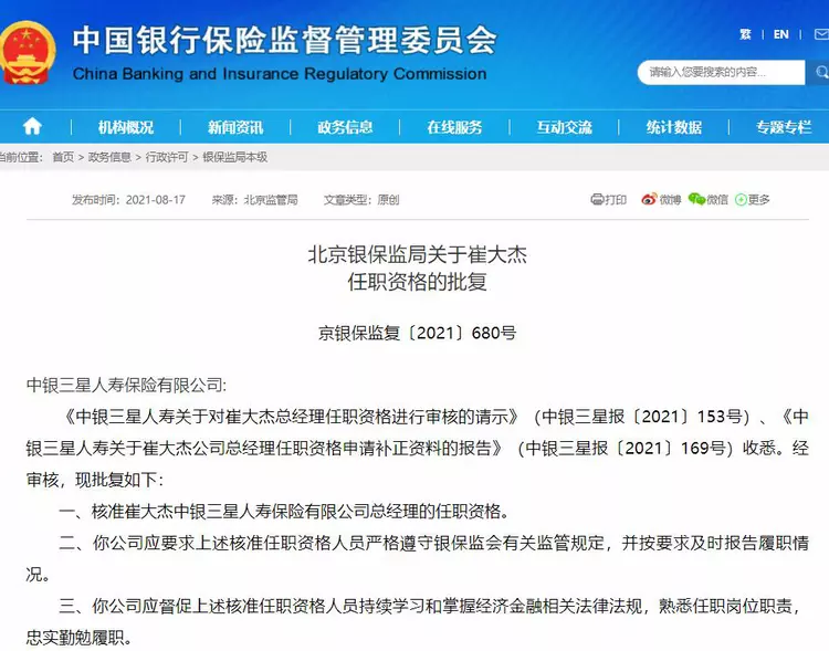 8月17日,北京银保监局发布行政许可信息称,核准崔大杰中银三星人寿保险有限公司(以下简称“中银三星人寿”)总经理的任职资格。CXO UNION CXO联盟 cxounion.cn