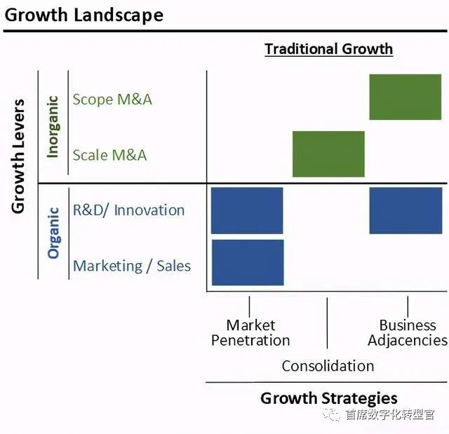 传统上,ceo们依靠三种主要的增长战略:市场渗透,巩固和扩展到邻近的业务。市场渗透推动了现有市场份额的增长。合并合并竞争对手,以增加收入,加强市场领导地位,并推动成本和规模优势。邻接增长包括进入新的产品和解决方案类别、客户细分和/或市场,提供补充性的新产品。 CXO UNION-CXO联盟(cxounion.cn)