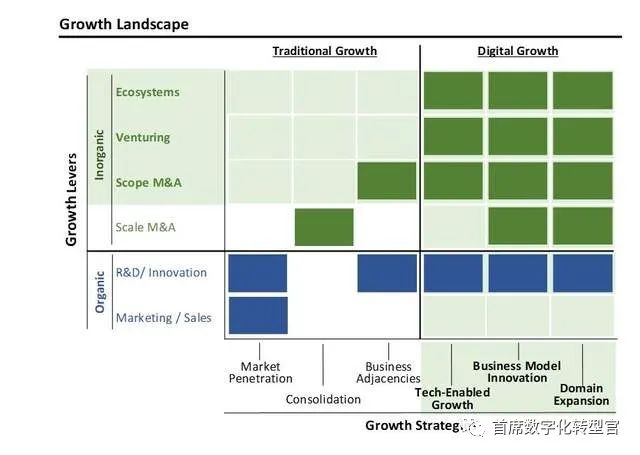 企业增长战略的转变,加上新的增长杠杆的效力,永远地改变了增长格局。在数字时代,在数字增长和外部(无机)执行的交叉口,现在出现了机会的“绿色海洋”。这种新的景观在外部/无机路径中提供了比内部/有机路径更多的入口点。这并不是要贬低有机驱动的增长和创新的价值。内部创新实验室、数字增长努力和其他本土活动是数字时代整体增长战略的重要组成部分。相反,我们的目标是指出,外部格局已经变得多么重要和广泛,并指出,我们认为,这种格局的转变是机遇集的永久性重组。 CXO UNION-CXO联盟(cxounion.cn)