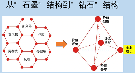 如何从石墨的结构到钻石的结构?比如吴春波老师讲华为里面的价值创造、价值评价、价值分配,我加上一个东西就成了钻石的结构,加一个价值理念,你的价值理念决定了另外三个东西怎么结合,形成非常坚强的企业组织的价值,或者叫强力的东西。