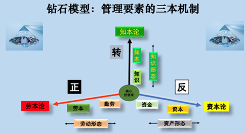 我们在转,转念、转型、转行,不管转什么,反正是在转。为什么是转呢?有句诗是这样写的,“爱不是相互凝望,而是一起凝望同一个方向”。我给转一转,“爱不仅是相互凝望,更是一起凝望同一个方向”,不就好玩了吗?一维到两维,我升到两维的时候,马上有四个招,不玩对抗了,按照这种思维做出来的东西,有四个方案,但是我可以升到三维,八个模块了,后备的更多,根本不知道往哪儿转,这是三维的东西。我把管理的东西按照三去分——钻石模型,钻石模型是按照三个三角凑起来的东西。比如劳动创造价值,资本投资创造价值,还可以转向上面——知本论,知识才创造真正的价值,数据现在成了最重要的资产,就转了,如果劳动是正,资本是反,转到知本上,照样可以在高科技公司,用技术、专利、认证的各种东西来做。所以,按照这种思路,我们转出来的另外一个方向,但是中间的“结”非常要紧,包括了企业家精神、管理机制等。