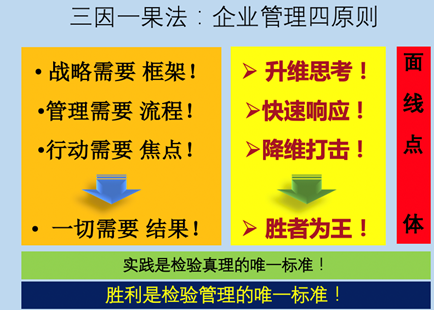 用“三因一果”的方式说管理,战略需要框架,管理需要流程,行动需要焦点,最终你得把果拿出来,不管是什么框架,什么体系,不管科学不科学,不管流程做得怎么样,最终得赢别人。这个结构在转什么?就是升维思考,想的时候灭别人一维,快速响应,流程是管速度的,然后是降维打击,真正灭你的时候是非常多的东西,让你不可能抗拒我。最后一个是胜者为王,我赢了什么都对,我输了什么都不对,最终得有果。所以,管理者最难的事情是取胜,打胜仗,后面的东西说说而已,反正有三个道理,就是面、线、点,最后要的是立体。这个立体,就是你活着,你存在。