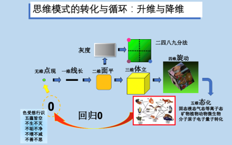 点、线、面、立体,上边是灰度,下边是平面四分法,到这里还是两维,再往前走是动起来的时间维。如果觉得太累了,你找个活着的生态圈就行了。如果觉得还累,难受,赶紧投胎去,清零不就完了吗?所以,人生就可以根据各种维度,让自己找到绝对的自由,于是我们在做的是什么?不就是一种思维的东西吗?0到1,1到N,N到1,1又回到0,无中生有,一分为二,三分之法,四个象限,三维空间,时空为王,合二为一,一归于零。