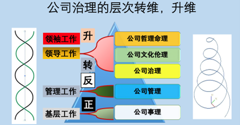 公司治理,首先是事理,然后是管理,然后是治理,再有是文化伦理,再有是哲理命理,你现在在忙什么?如果不能升维,忙的这些事不就是重复吗,不就是循环吗?所以,正、反、转、升,按照这种思路,升到管理工作,升到领导工作,太累了,干什么?领袖,就行了,思想领袖。