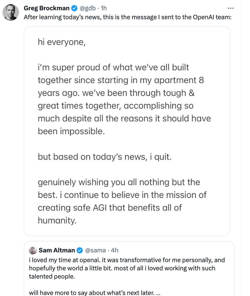 In other words, eight years after its founding, OpenAI has become the most watched technology company in the world for less than a year, and the two core founders have left at the same time. Both Sam expressed shock at the incident, and they were still trying to figure out what the cause was.