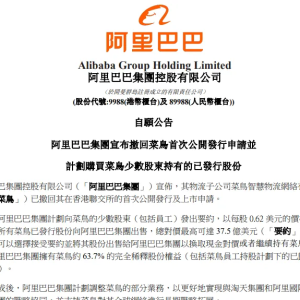 一、突发!阿里巴巴宣布:撤回菜鸟上市申请!270亿元收购股东及员工持股