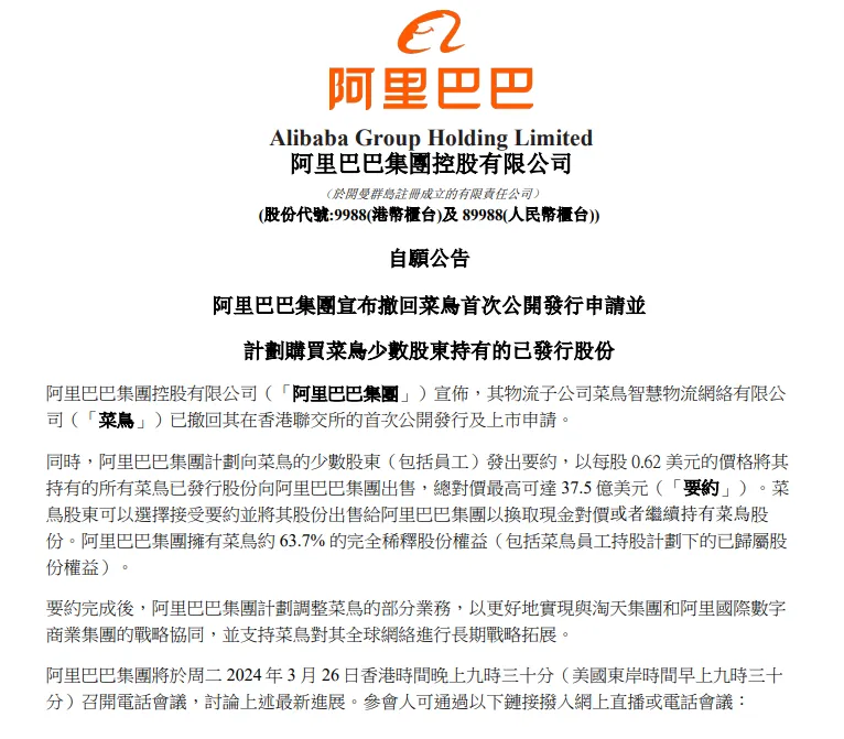 在撤回菜鸟港股IPO申请之际,阿里巴巴又抛出了一份要约计划。