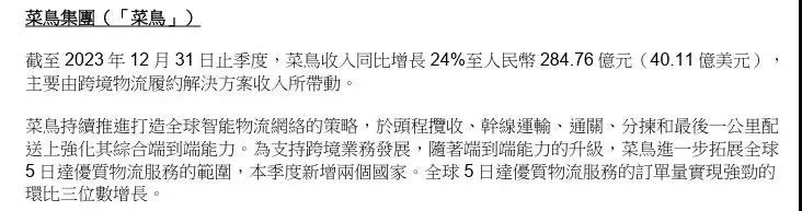 财务能力方面,菜鸟2023财年的总收入为778亿元,近三年的复合增长率达到21%。菜鸟的盈利能力也在持续增强,2023财年经调整EBITDA超过了28亿元。在阿里2月7日公布的最新一季财报中,菜鸟的季度收入同比增长了24%,保持了强劲增长。