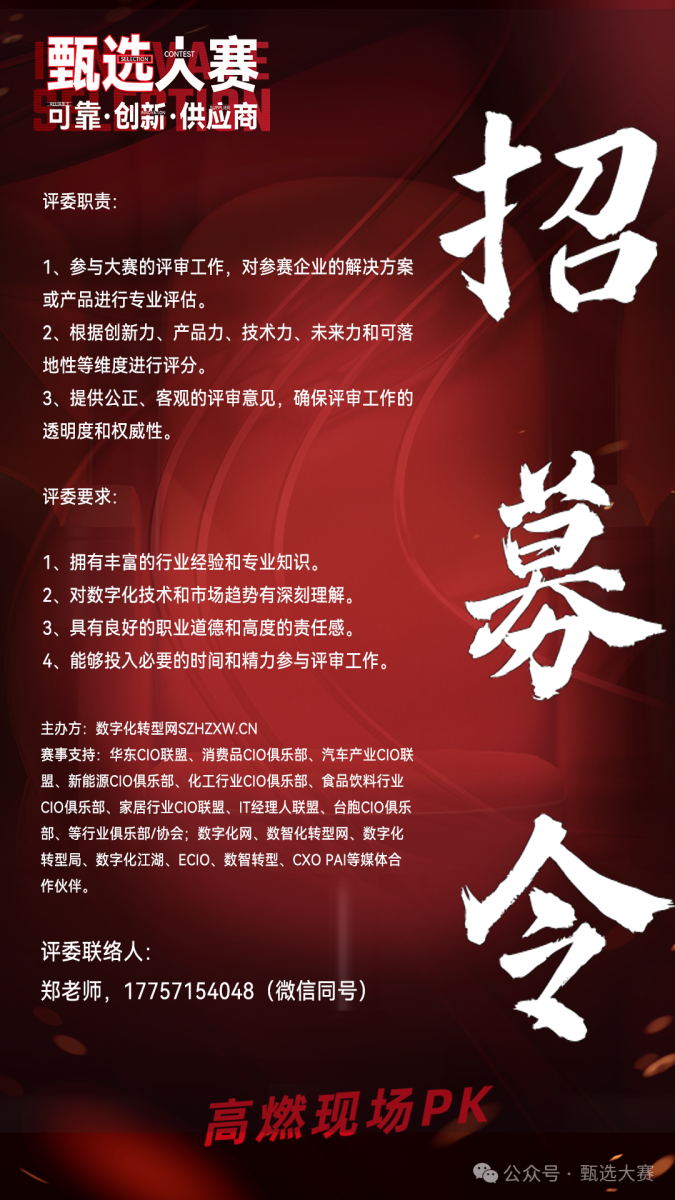 甄选大赛评委持续招募中,如您对甄选大赛感兴趣且有兴趣出席评委,可联系评委联络人获取评委权益及职责: 数字化转型网(www.szhzxw.cn)