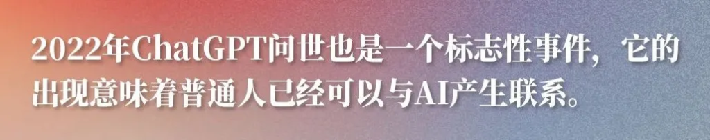 1. 2022年ChatGPT问世也是一个标志性事件,它的出现意味着普通人已经可以与AI产生联系。