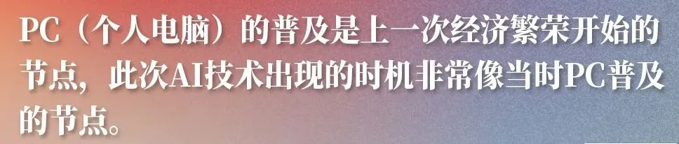 德拉:目前世界经济的确处于一个令人失望的状态,部分发达国家的经济甚至出现了负增长,我们迫切需要一个新的投资方向,所以我对AI作为推动经济增长的通用技术感到乐观。即使是罗伯特·戈登(Robert Gordon,美国经济学家),对信息技术和生产力关系一直持批评态度的经济学家,也会承认PC(个人电脑)的普及是上一次经济繁荣开始的节点,此次AI技术出现的时机非常像当时PC普及的节点。