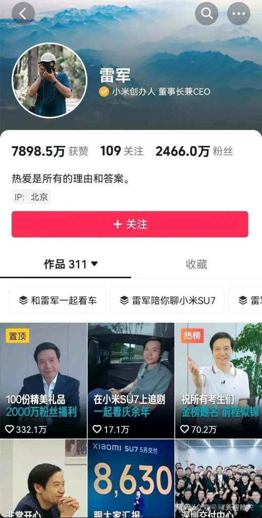 Lei Jun’s daily vlog on Tiktok is deeply liked by young people. On the one hand, the content is the “daily life of successful people” that the audience is more concerned about, satisfying the curiosity of the public for entrepreneurs. On the other hand, from the perspective of content, there is no preaching or chicken soup, which is more in line with the preferences of contemporary young people.