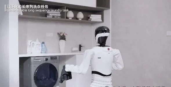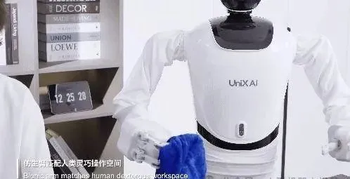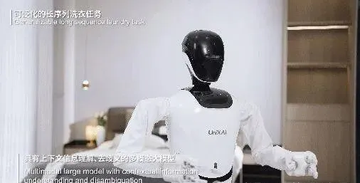 目前,UniX AI开发的轮式+双臂人形机器人,作为家庭服务机器人,可以自动识别你乱扔在家里各个角落的衣服,自动捡起并拿去洗衣机洗,还能在你吃完饭后给你收盘子、洗碗,还能清洁地板。