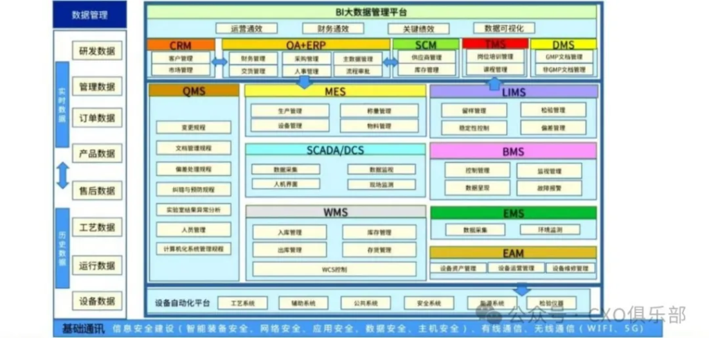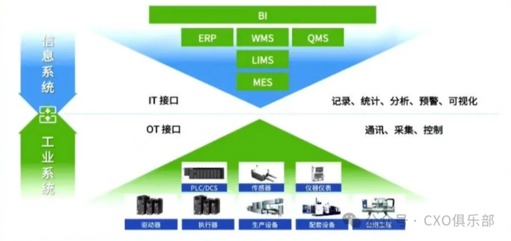 再这就是一些中间层面的,比方说质量管理系统,还有一些底层的一些技术通讯,一般记录通讯的话,基本上肯定现在很多工厂都是多工厂多地域的一个连接,就是它的一些信息传输是如何做到信息安全的,包括他的一些VPN的建设,最近这几年又有很火的一个技术,包括我们公司也正在使用到一些就是把各个厂区的工厂进行一个连接,还有一些比方说分布在广州上海的这一些销售公司,他们的一个通讯,然后这一块用了一些数据管理,数据管理把以前的历史数据和现在的实时数据进行然后进行一个融合和使用,然后再有在利用一些新的技术,比方说大数据、云计算,还有这些物联网,还有一些arvr的话现在这一块就是说在医药行业这个是刚开始使用用于一些远程的为指导的维修培训等等,特别是有一些可视化的培训,而这一块是两化融合的一个概念,it和ot主要是介绍的it和ot。It的话一些比方说BI这些系统,ERP这些智能端的一些系统,它的记录统计分析,包括它的一些预警的可视化平台,ot接口的话主要是做一些通讯采集和控制,主要是用于车间一些就说顶层的物联网的设备,最后通过一个系统把it和ot进行一个连接,做一些数据的采集。
