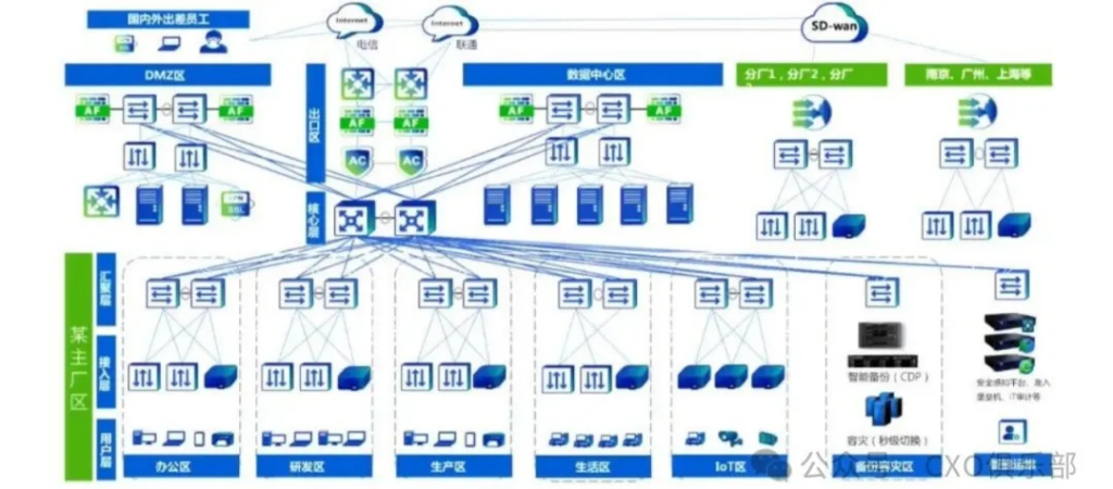 从顶层上来说的话,基本上就是两条专线,就是电信和联通进入,到了一个出口和核心下面,基本上每一个工厂都会分为就是说办公区和研发区,然后生产和生活,然后还有一些物联网区,也就是说各个行业对网络安全这一块也是特别的重视,就是说去建设一些备份容灾,包括所有的数据做一些智能化的、多地域的、多层次的,还有一些离线的数据的备份。