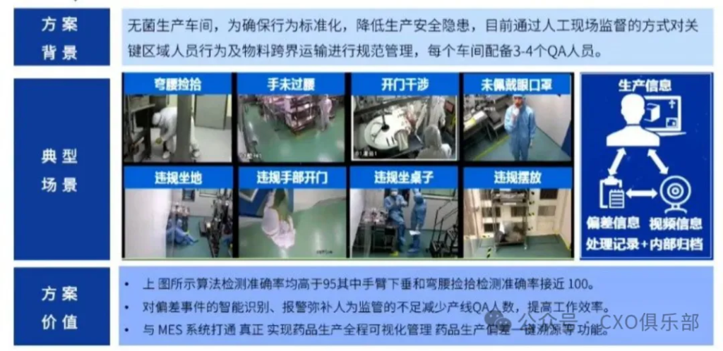 现在是人工智能的时代,但是人工智能时代就是在智能化工厂它的有一些应用是什么?我们能用到的。还有哪几个方面,主要是有一些行为检测,视觉检测技术,而这一块主要是人工智能GMP,就是对药企来说,对他们的工作的辅助,比方说有一些比方说典型的场景,比方说弯腰手背过腰,它就是说比方说这标准它没有达到,在通过检测的话可以及时的预警,还有一些违规等等,他检测率是非常高的,这样的话可以提高就是说一个人员的一个效率。