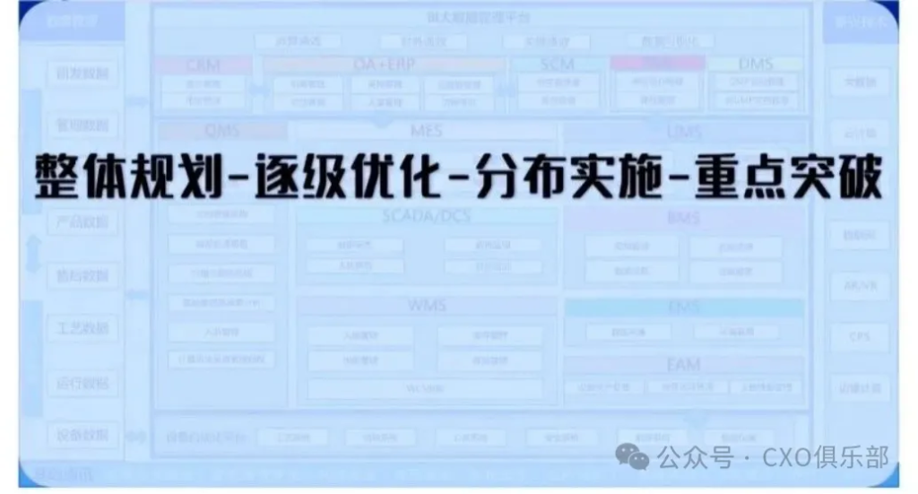 今天第二个方面就是介绍一下智能化工厂的数字化的整体规划蓝图,然后这一块从顶层上来说,一些大数据平台,运营层面,比方说有crmoa加ERP,还有一些scm,然后还有最终的数据可视化的。