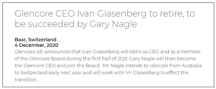 近日,嘉能可在官方网站正式宣布,担任公司CEO十八载已63岁的的伊万·格拉森伯格(van Glasenberg)将于明年上半年退休并退出董事会,接班人是现年45岁的煤炭业务负责人加里·纳格(Gary Nagle),他将成为嘉能可“第三代掌门人”。