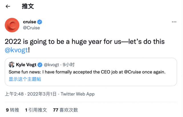 3月1日,Kyle Vogt在其个人推特账号上正式宣布了要担任Cruise CEO的消息,随后Cruise官方账号也转了他的推特并官宣确认了这一消息。