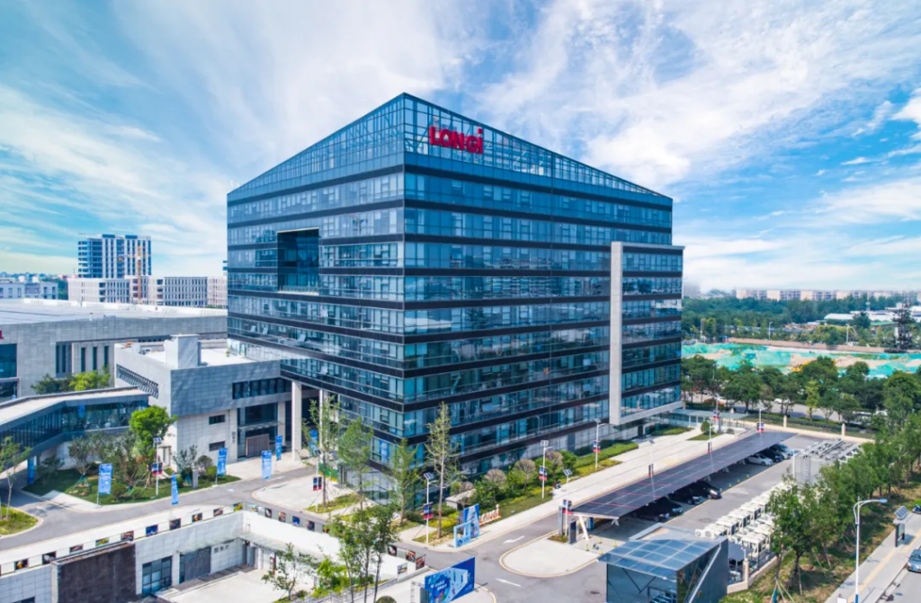 隆基绿能总部(黑色腰线为隆基产品)。在隆基绿能董事长钟宝申眼里,过去,隆基绿能依靠持续创新,加上全球光伏市场增长,“几乎比业内所有同行都吃到了更长时间的红利”。