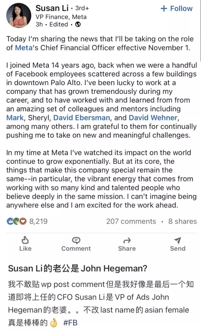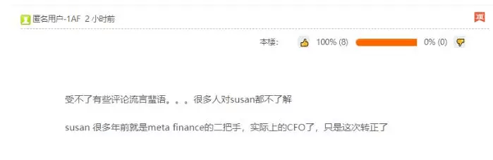 甚至有疑似内部人士说,其实Susan很多年前就是meta finance的二把手,这次只不过是转正罢了。