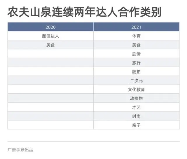 在今年参与引擎奖评奖的过程中,可以发现很多品牌在去年达人营销的尝试上堪称「激进」——农夫山泉在2020年只与颜值和美食两类达人进行过合作,到了2021年,它合作的达人已经分布在11个垂类中。与此同时,达人制作的内容数量增长接近2倍,品牌形象跟随达人覆盖了更多圈层的消费者。