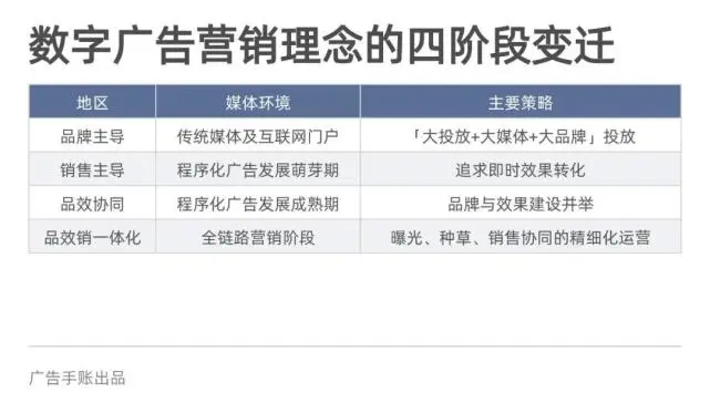 事实上,梳理过去十余年广告营销理念的变迁,能够发现一条从品牌主导、效果主导、品效协同到品效销一体化的历史演进脉络。