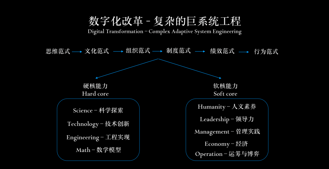 数字化改革是一个复杂的巨系统工程,需要从思想、流程、文化、组织、评估标准等一体化、系统化的范式改变,其中包括硬核能力和软核能力。