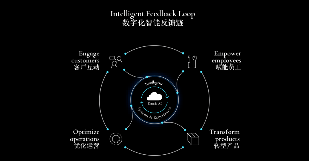 微软有一个被俗称为“蝴蝶图”的数字化反馈链框架,就是利用数字化技术,无论是用于办公的计算机,还是各种传感器,针对人类社会系统的每一个“人、事、物”单元嵌入数据采集点,在这种情况下,一台计算机或者手机,也可等价为一个传感器。以一个企业为例,通过数字化技术实现的数据“生成-采集-传输-存储-计算-应用”功能可以被内嵌至企业的员工、客户、产品和经营流程的每一个管理节点,由于硅基传感器和电子信息通讯的特征,这种系统可以随时随地不断产生与分析数据,这种计算而得的数据洞察,就可以帮助人类进行高效与技术的决策与行动。