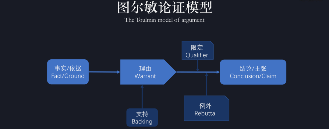 图尔敏论证模型很好地实践了每一个理性完备的论证都由前提条件“约束”,该模型认为结论需要靠逻辑推理和事实约束实现完备。这个模型的好处是,一方面给你一个空间继续加支撑体系,同时更精准地约束,更重要的是每一个论证想真正完备,需要有额外出口,也就是要有例外。用这种方式论证任何判断、逻辑都会比较完备,而且技术人群在推出某些观点、建议时,用这个模型会考虑更加全面,不会丢三落四。