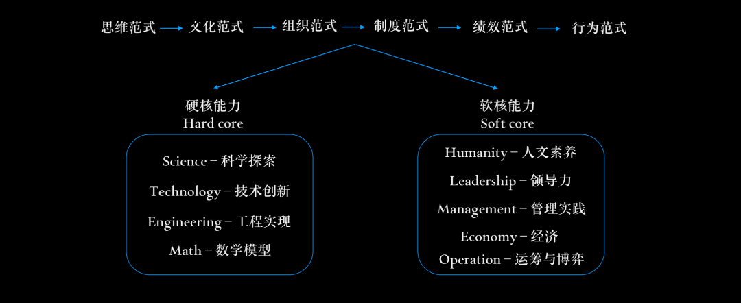 硬核能力:包括科学、技术、工程和数学。其中科学讲究的是突破,技术讲究的是创新,但是非常重要且丝毫不可忽视的是工程实现能力,如系统工程,软件工程,在应用上远比追求技术的先进性更为根本。