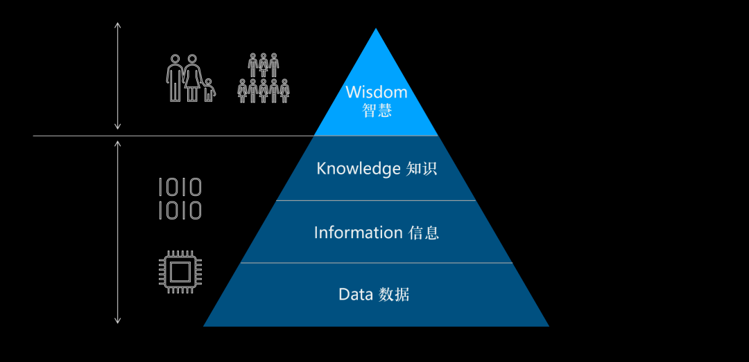 提到信息论,我想再说说 DIKW 模型——数据、信息、知识、智慧。这其中是有分工的,有些需要人来做,有些需要机器来做。这也会牵涉到信息含义的作用,要想深刻理解这一点,大家还需要去了解卡尔波普有关物理世界、精神世界和知识与信息世界的“三个世界”理论,以及信息最终产生作用的语法、语义和语用的异同,这里先不做展开。