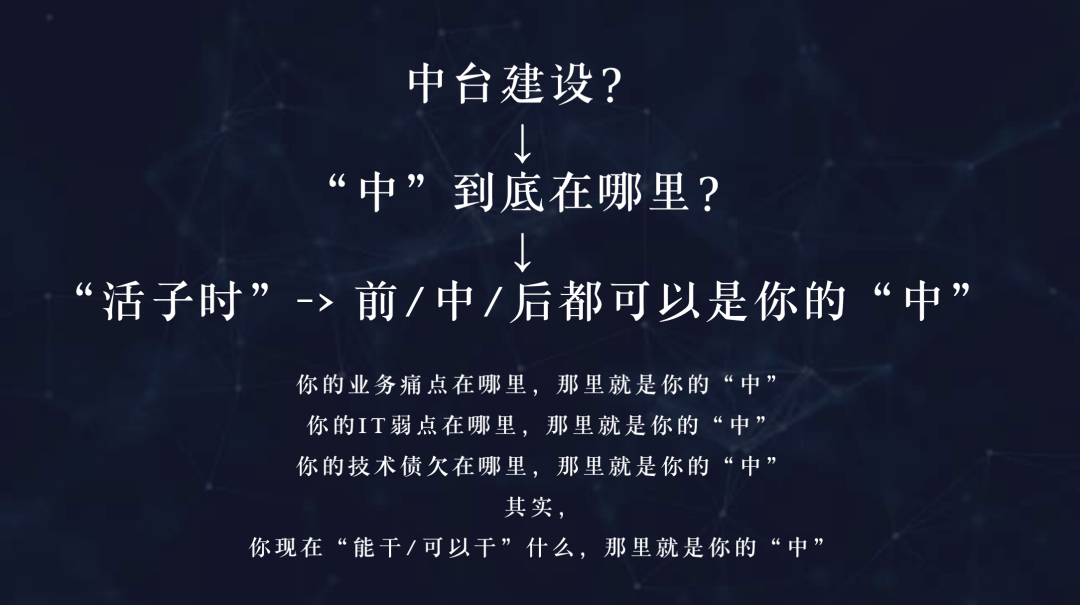它就是平台的不断迭代、优化、再造,是流程再造、系统再造,何必要约束住是“中”呢?过去几年,我们花了多少精力去学习、理解什么叫“中”。把它当作是平台,知道它要解决的问题就可以了,很多 CIO、CTO 看穿了这个问题就天高任鸟飞,海阔凭鱼跃了。