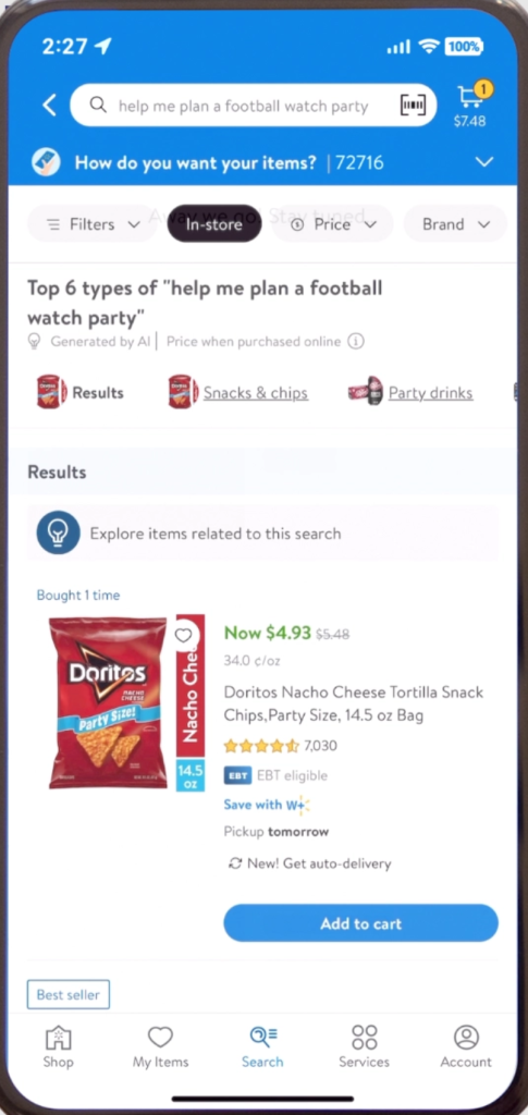 其中一款是生成式AI驱动的搜索工具。这款工具结合了微软的AI模型和沃尔玛的购物者数据,使购物者能够按特定用例搜索产品。借助GenAI的能力,消费者可以按照具体使用场景进行搜索,系统随即会生成跨类别相关商品推荐,大大缩短消费者的浏览与寻找商品的时间。