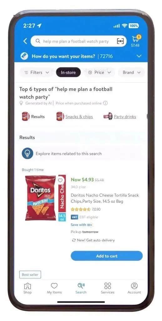 手机上的沃尔玛应用程序,沃尔玛全新的由 Azure OpenAI (国际版)服务支持的搜索功能将在 iOS、Android 和沃尔玛网站上使用。图片由沃尔玛提供。