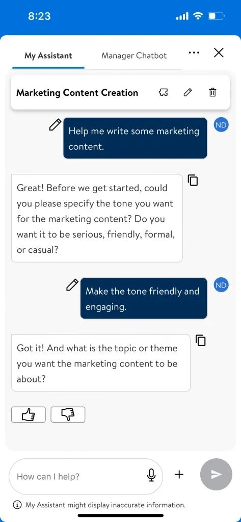 沃尔玛的“我的助手”应用程序可帮助员工完成一系列任务,从汇总长篇文档到协助创建新内容。图片由沃尔玛提供。