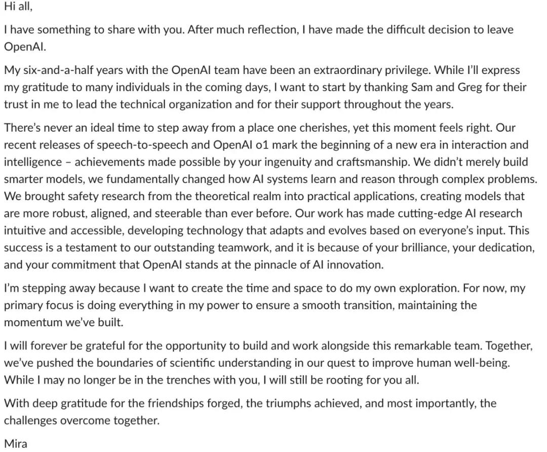 以下是Mira Murati离职内部信: