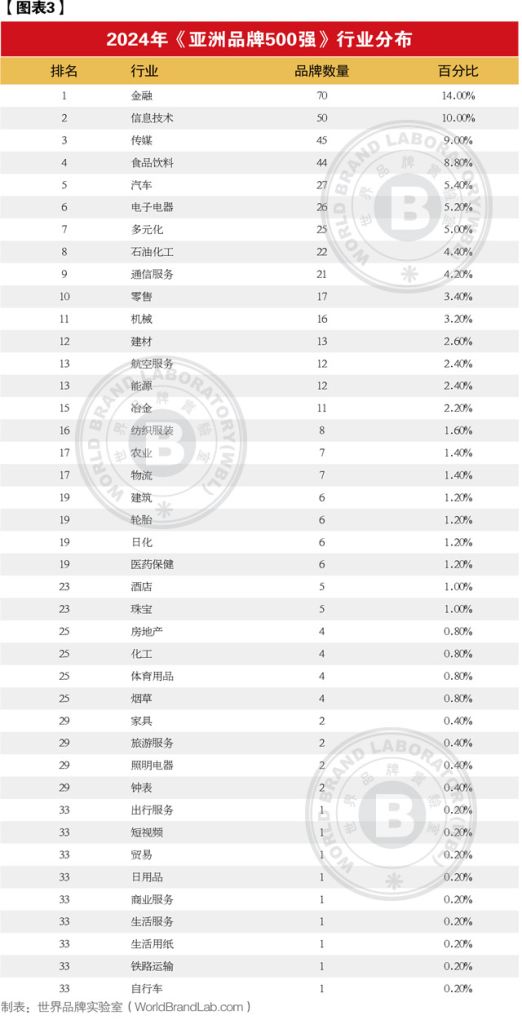 此次入选2024年《亚洲品牌500强》的品牌共涉及41个行业,其中金融行业排名第一,共有70个品牌上榜,占比14.0%;排名第二的信息技术(含通信电子)行业有50个,占比10.0%;排名第三的传媒行业有45个,占比9.0%,食品饮料有44个,占比8.8%,位列第四。排名第五到第十的行业分别为:汽车27个(5.4%);电子电器26个(5.2%);多元化25个(5.0%);石油化工为22个,占4.4%;通信服务21个,占比4.2%;零售17个,占比3.4%。与去年相比,金融、信息技术、汽车、通信服务、机械等行业入选数量有所上升,而石油化工、建材、航空服务等行业数量均出现不同程度的下降。入选数量最多的前10个行业共计347个品牌入榜,占总榜单的69.4%(见图表3)。
